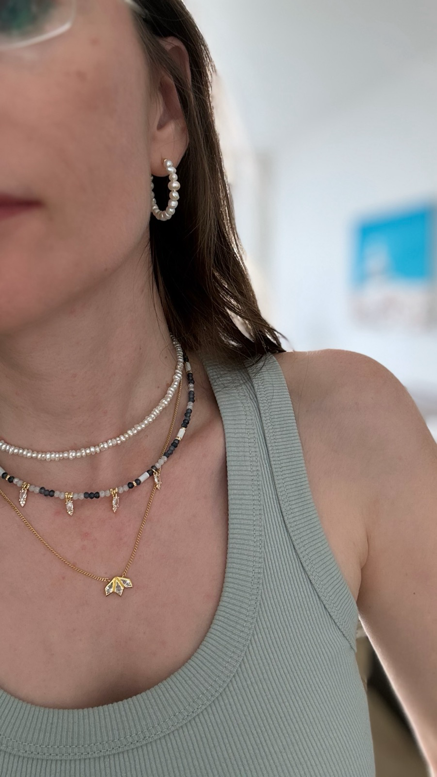 בשילוב הזה למשל, יש שרשרת צ׳וקר שאני מאוד אוהבת, וגם שרשרת תליון עדינה, וביניהן שרשרת צבעונית שאני נוהגת להחליף בהתאמה לצבעי הבגדים.